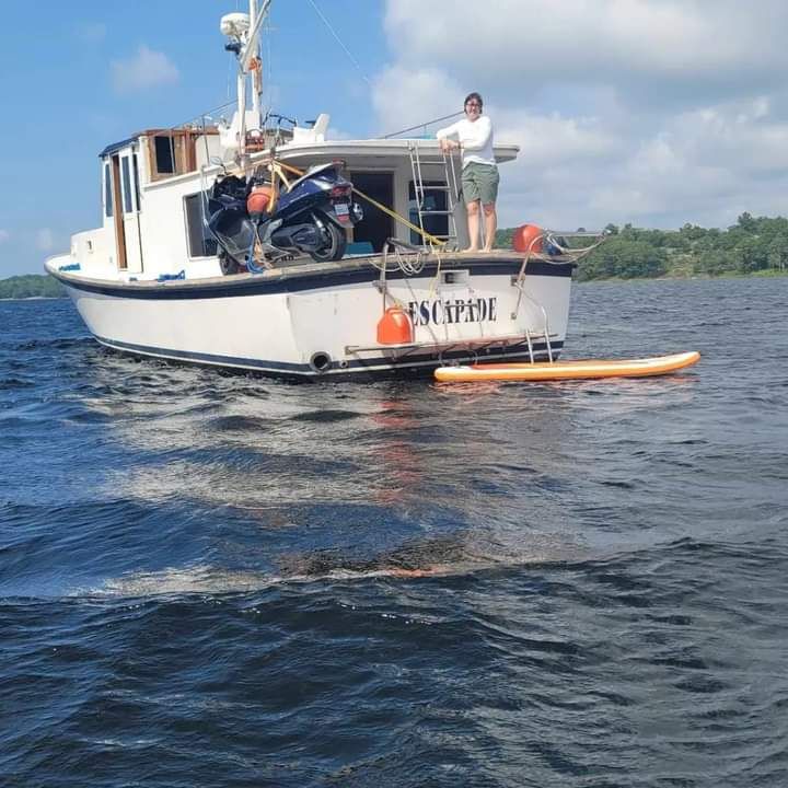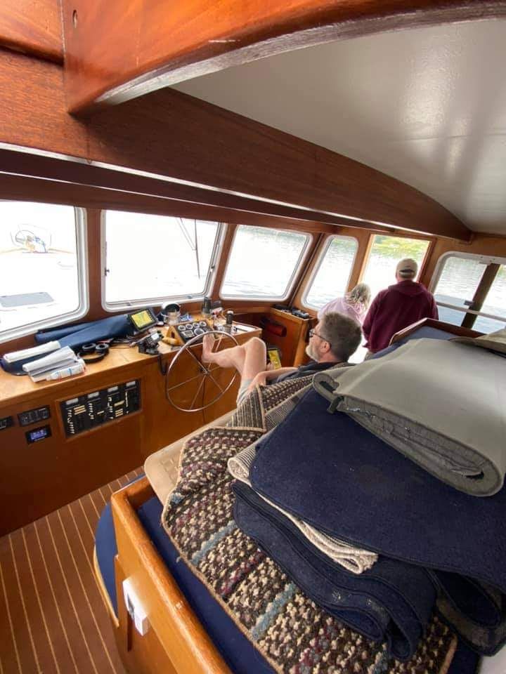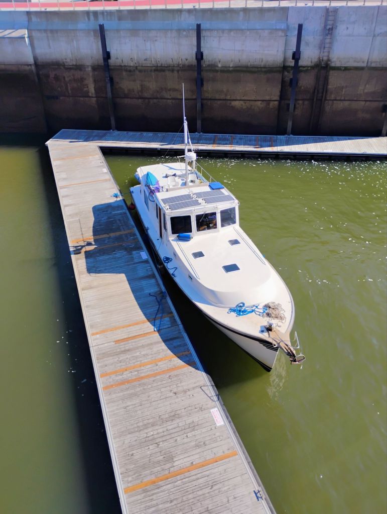 Hull, deck and topsides painted LPU. Small deep cockpit with lots of storage space. The boat deck is currently unused. There was a steering station but I’ve removed it. Lots of possibilities for a large flybridge and/or small boat storage. There is a small crane on the port side used to load motorcycles on and off the deck. Radar mast easily lowers for bridge clearance. 700w solar installed on pilothouse roof.