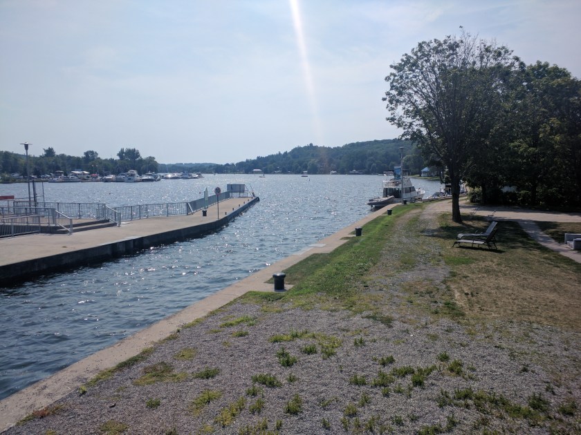 Anchored for the night on Rice Lake by the entrance to the Otonabee River. Relaxed operation today, stopped for an hour or two in Hastings. Tomorrow I go up to Peterborough to meet Sam and Sarah. It was hot and mostly sunny today, and I was mostly inside the last couple of hours seeking shade. Even with the bimini it’s hard not to get cooked.