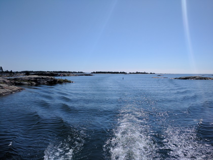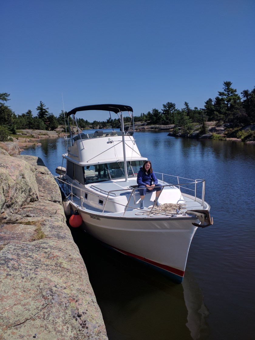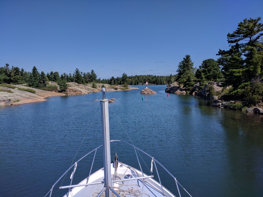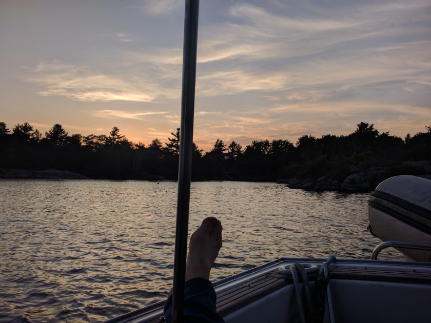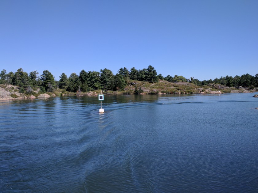 This morning we had a nice trip back down to Britt where I dropped Mallory off. Like yesterday it was grey and windy in the morning, but again the afternoon and evening was clear and warm. I continued back south to Pointe au Baril. Am anchored now maybe 30m from shore in a nice spot, no cottages around.