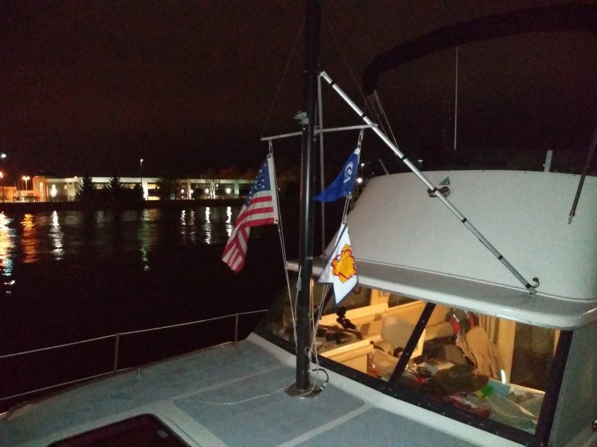 And here we are tied up in Peoria. I don’t mind the look of the radar mast. It works as designed, I’ve popped up and down a couple of times to go under bridges.