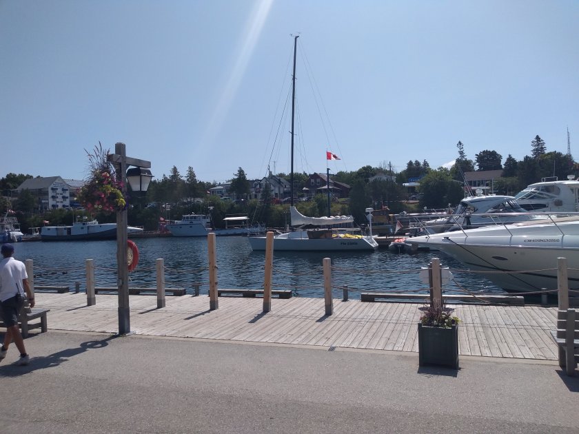 So I ended up doing the last half under main alone. That was fine. It was blowing about 20 knots from abeam. I took a brief video sailing towards Flowerpot Island. Got into Tobermory around 8:00. Today is a lay day, and Sarah and Samantha are going to pick me up tonight and I’ll get the sail repaired and new runners made this week. Back up here this weekend for some more cruising.
