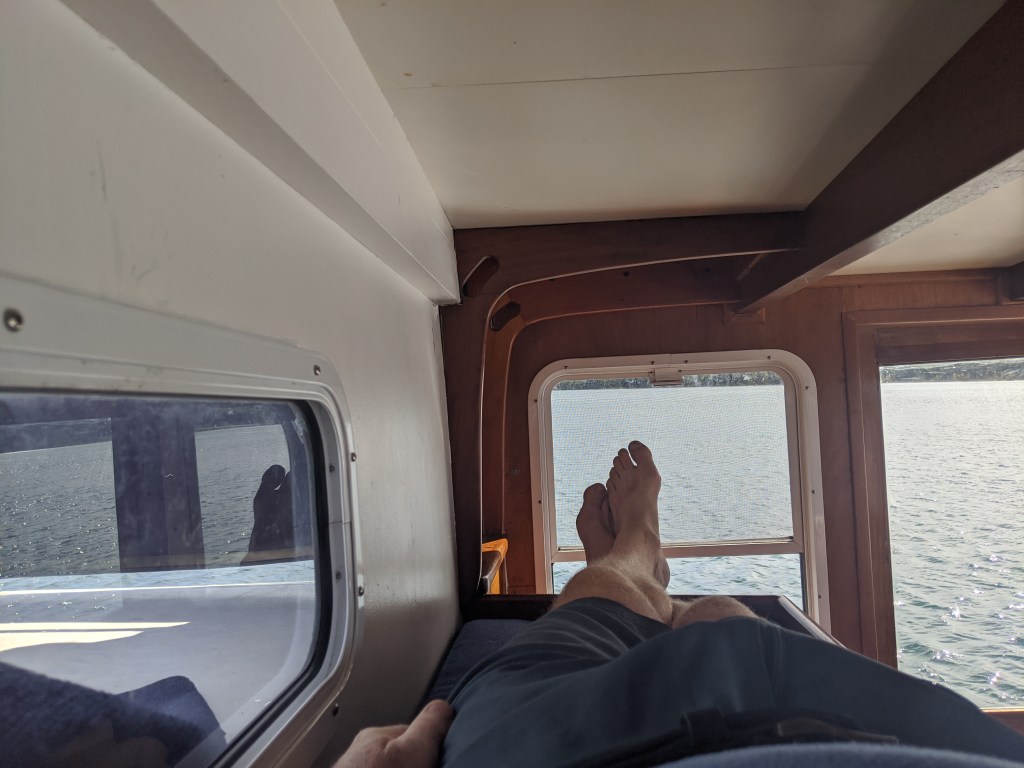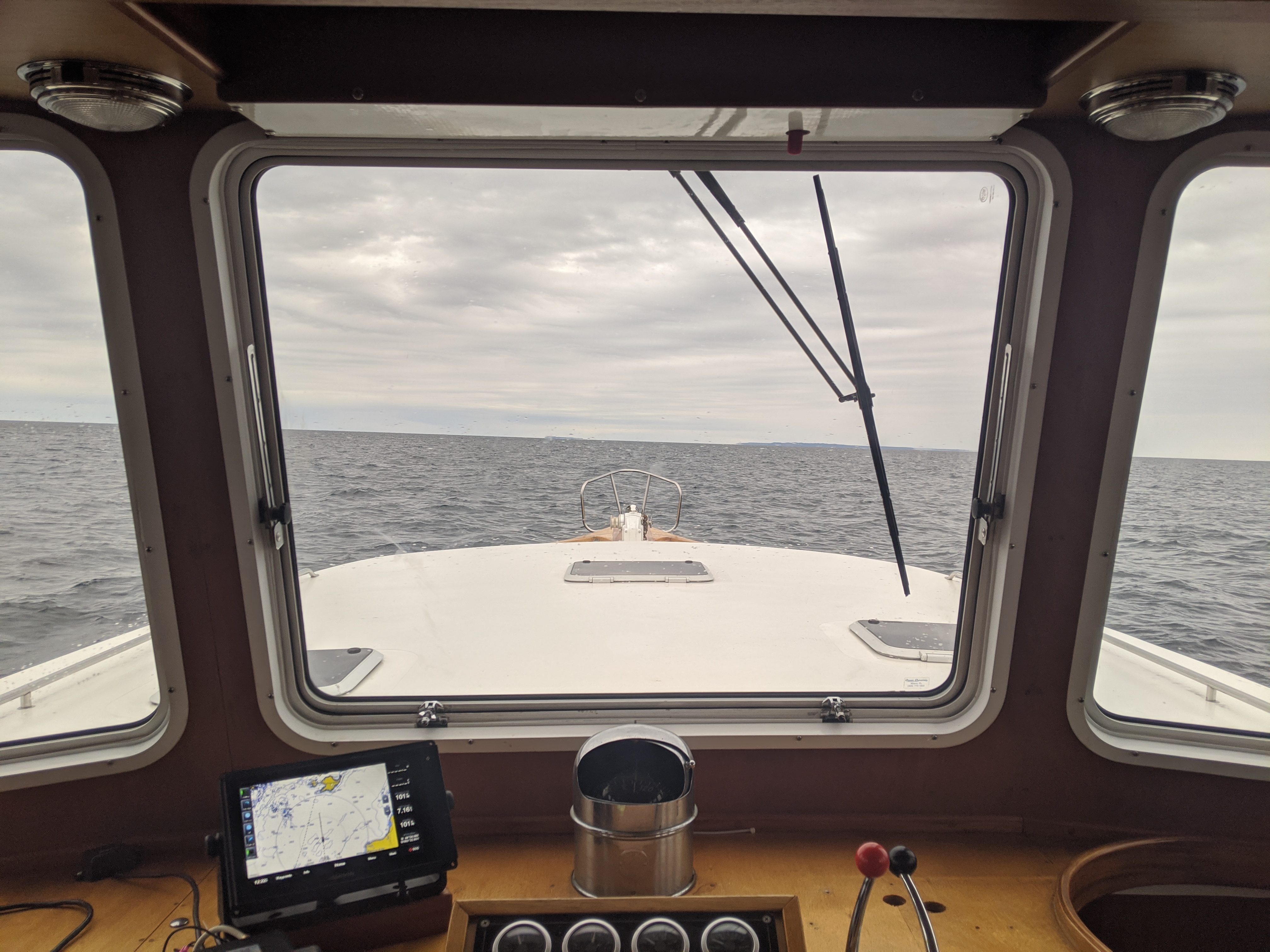 We didn’t have any major issues. The boat is able. Very solid feeling bashing into short steep chop today. The pilot house is marvelous. I spent some time in the berth up top, and it’s great. Secure with good sight lines. The three of us were hanging out there for much of the trip. I remain delighted with the boat.