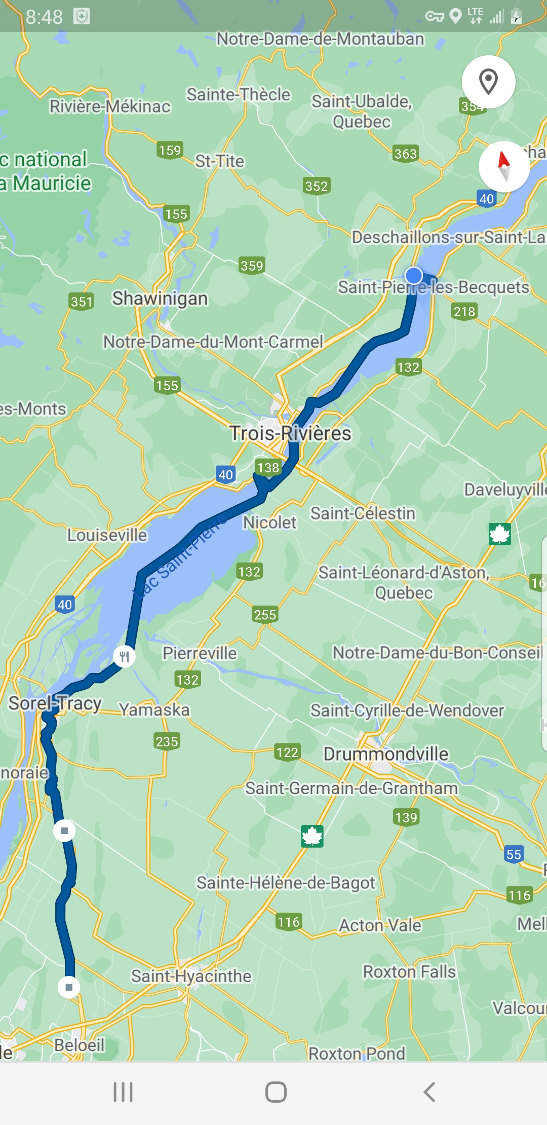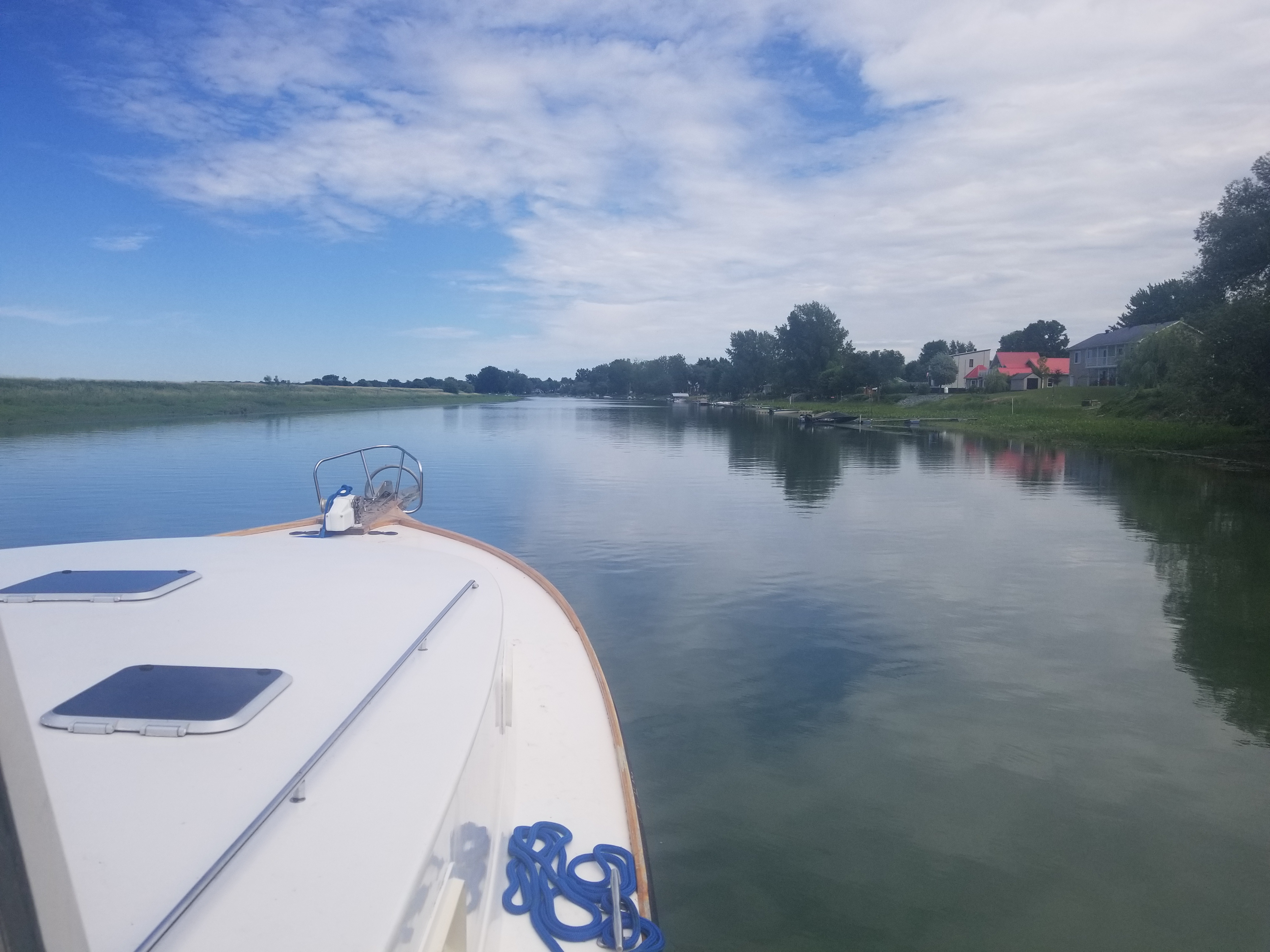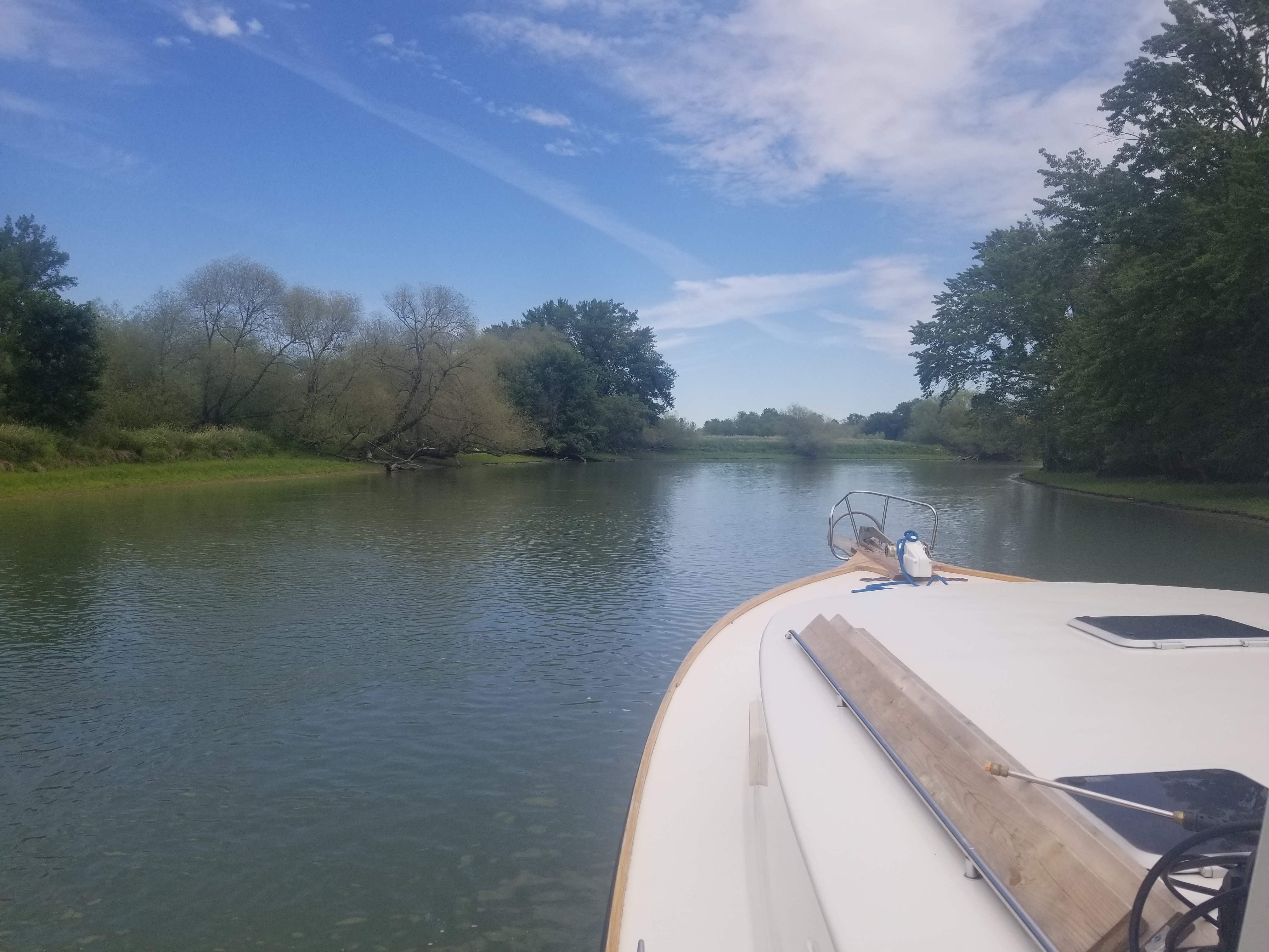 The area around Sorel is interesting. There are many islands that have been created by river channels. Some of the channels have been blocked at the top to manage flow. I was going to take the north branch that runs by Berthiaville, but some locals I chatted with at the St Ours lock suggested the southern branch instead. Lovely diversion, including a stop for takeout lunch at a waterfront restaurant.