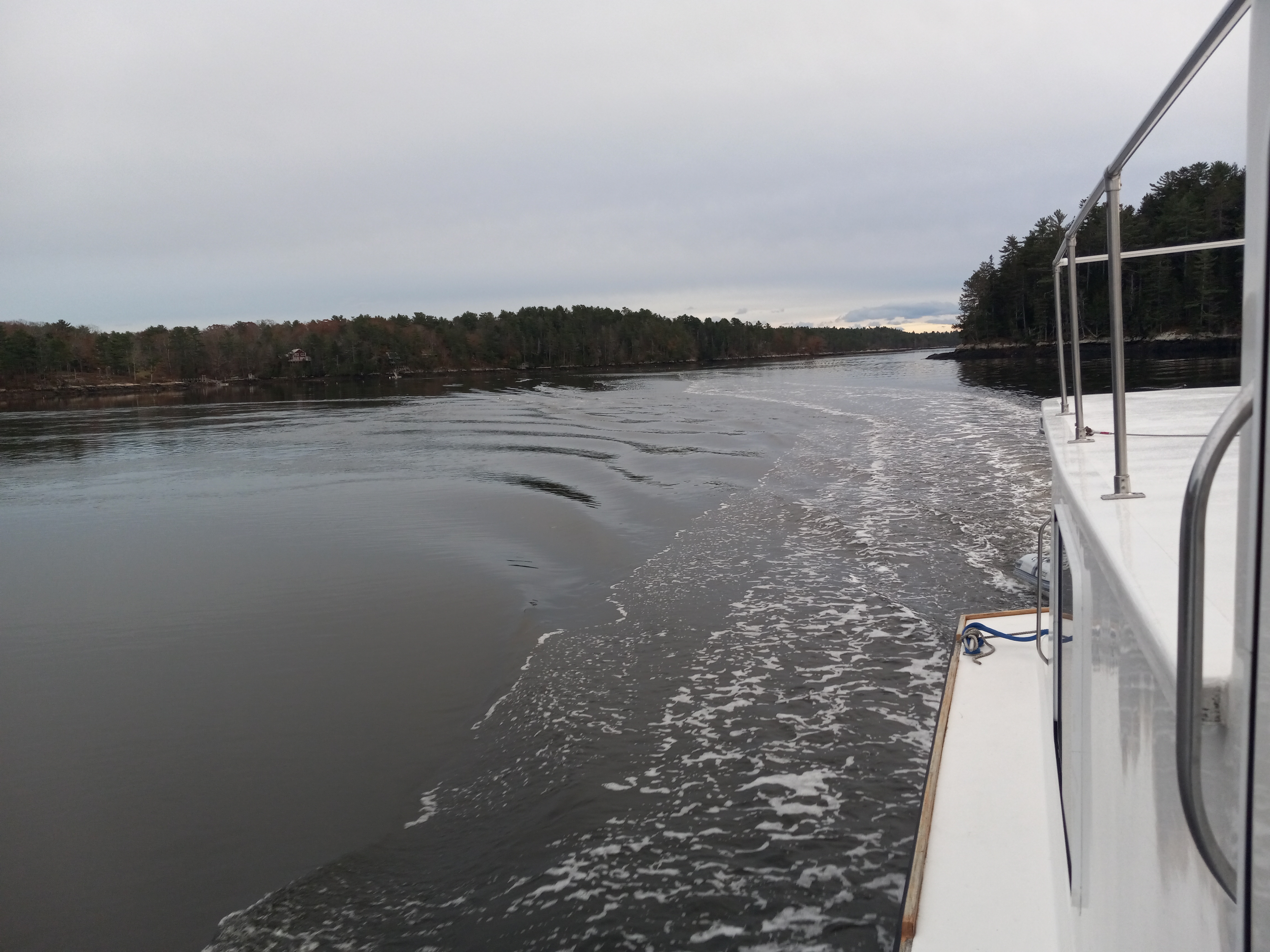 My cousin Cat arrived bearing pizza and snacks and stayed the night aboard, and this morning we cruised upriver to Bowdoinham, then turned around to go back down the Kennebec to the sea. Then down to Freeport. Nice day, and great to have her aboard for a visit.