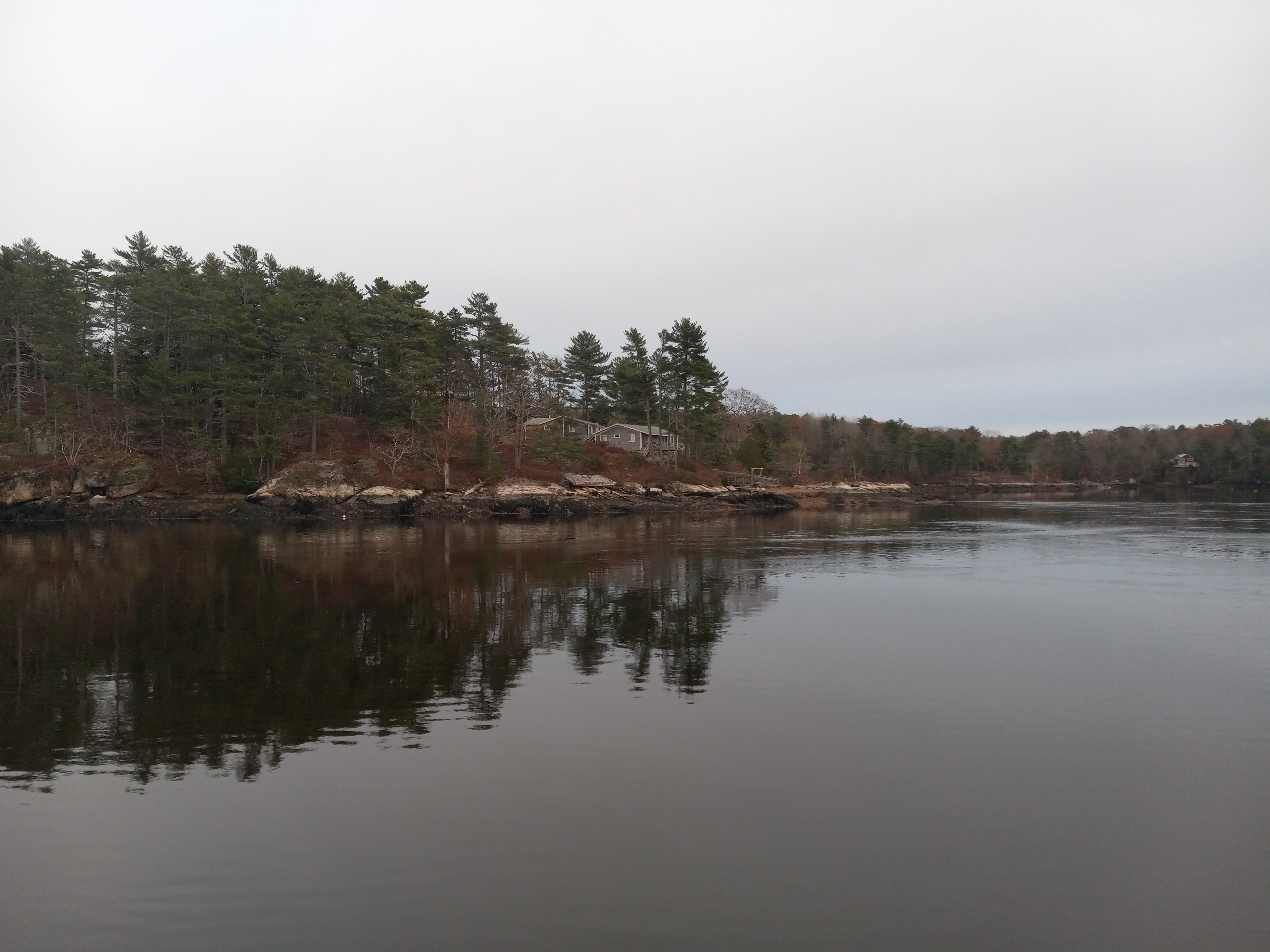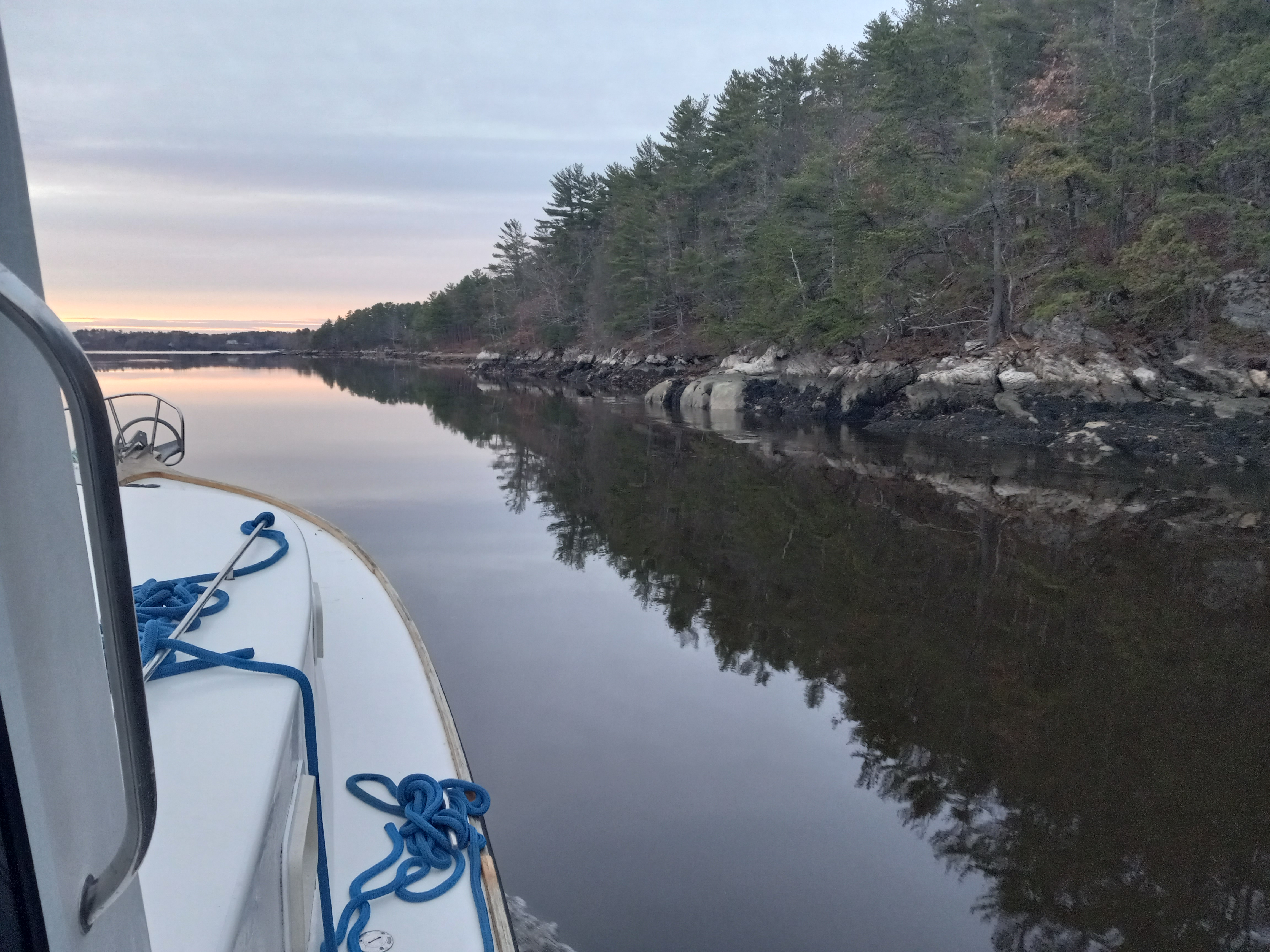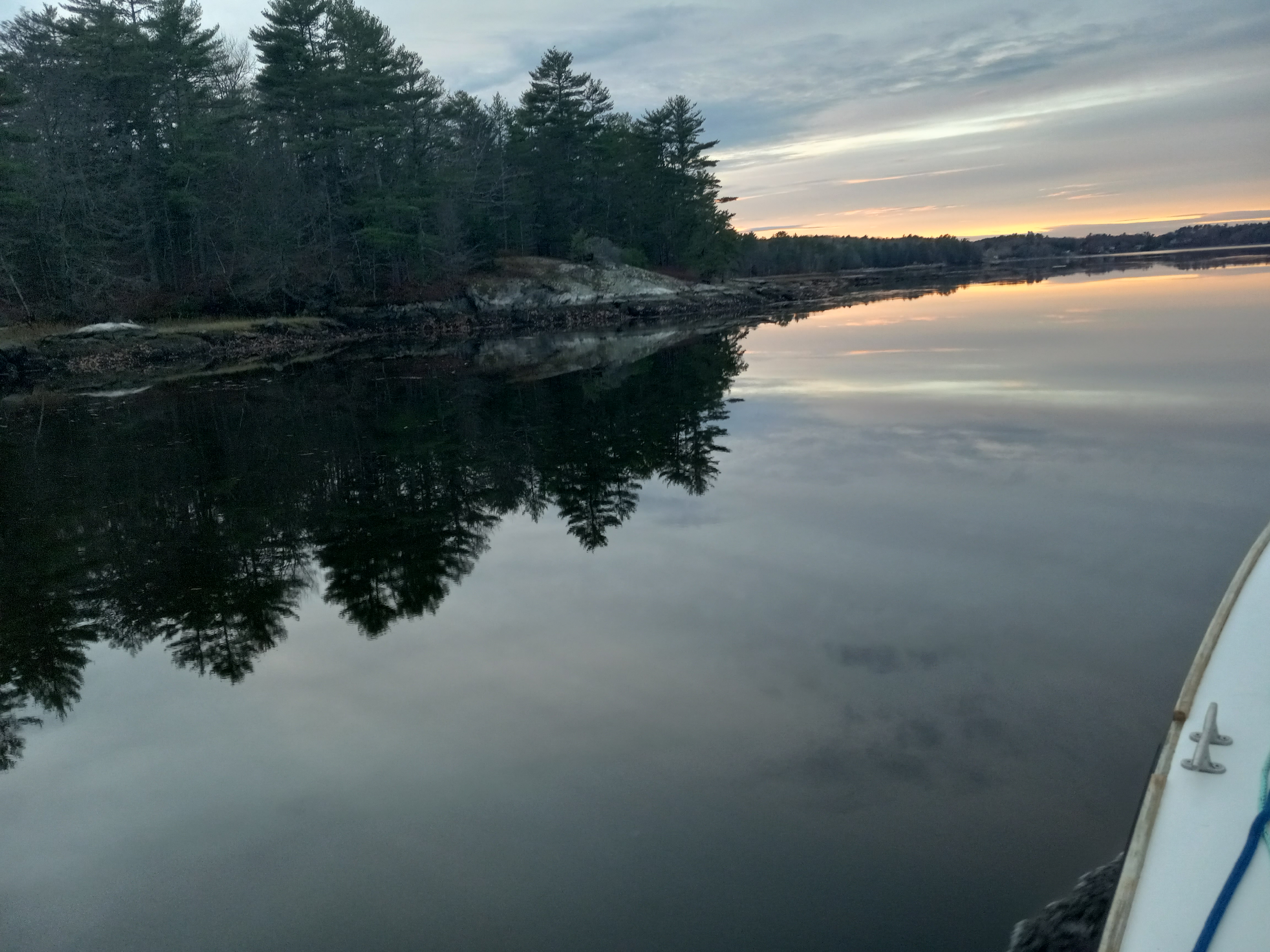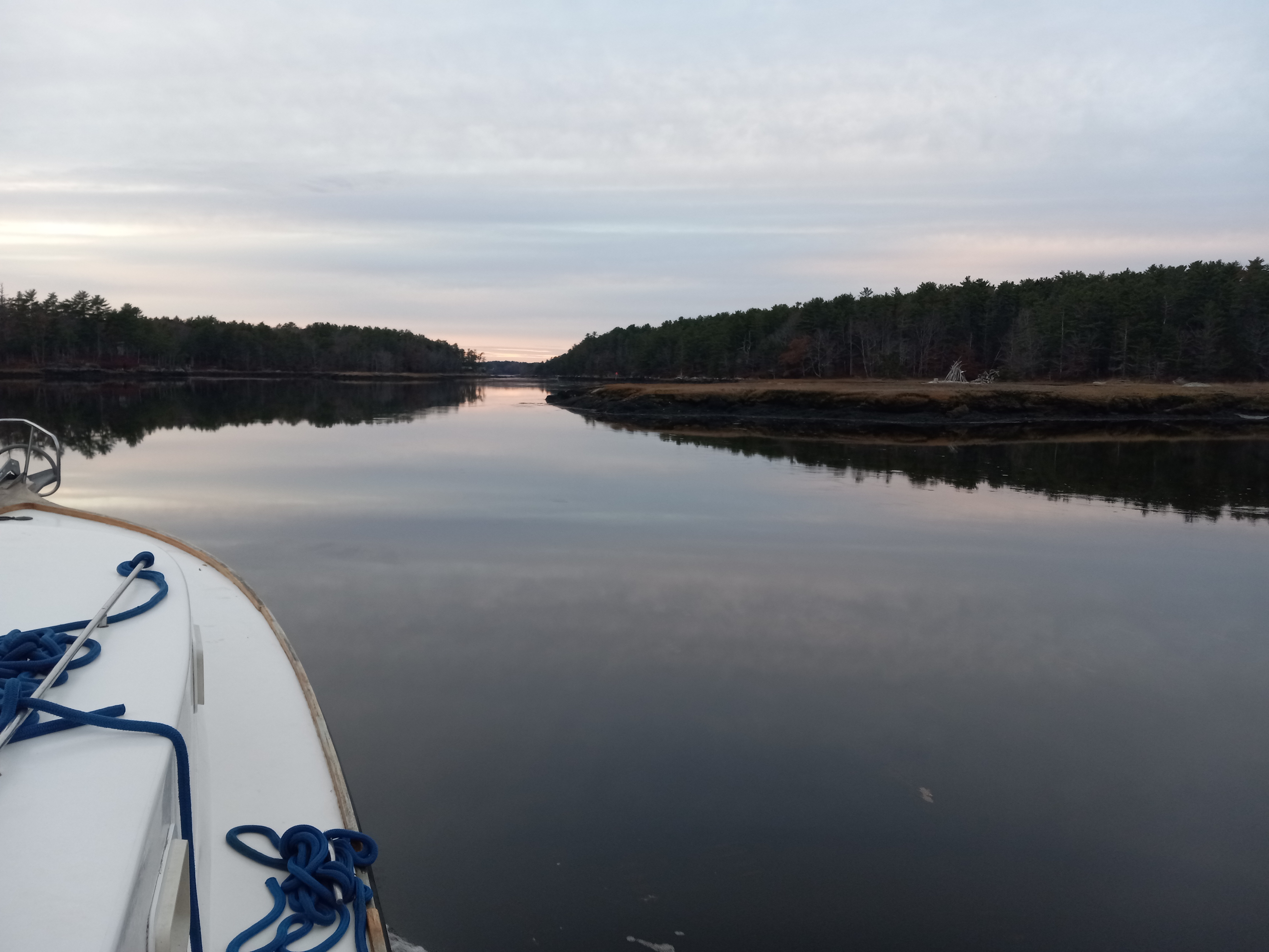 Yesterday was a fairly straight shot from Rockland to Boothbay Harbor, then up the Sasanoa River to meet the Kennebec River at Bath. I anchored just above the bridge at dusk. I always enjoy exploring rivers.