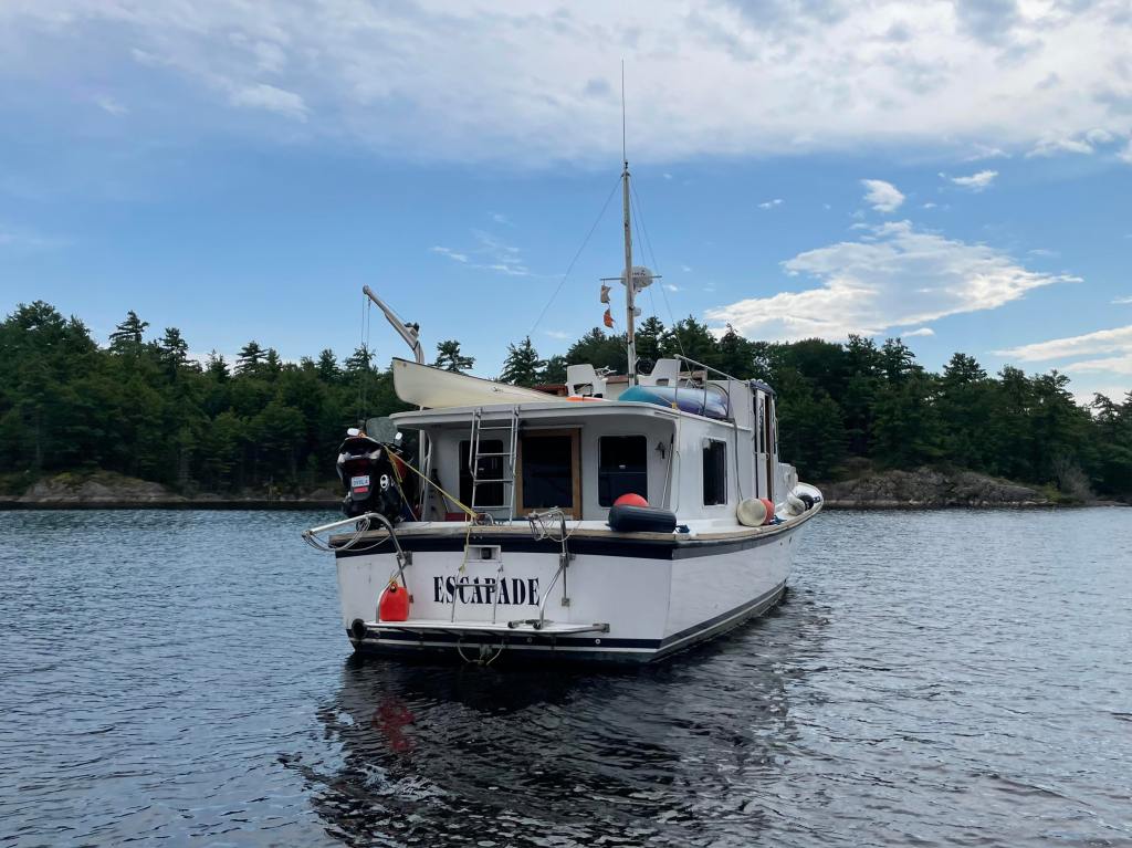 I came into the town dock today and gave Escapade a good wash down. Long overdue. Now we’re anchored not far away. Nice quiet spot.