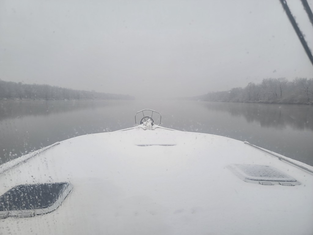 Yesterday was gloomy, but today sunny. The snow and ice on deck is now gone. Weather looks great for the next few days. As planned I stopped in Hardin last night. I anchored in the river across from Mel’s Diner and dinghied in to the town courtesy dock.