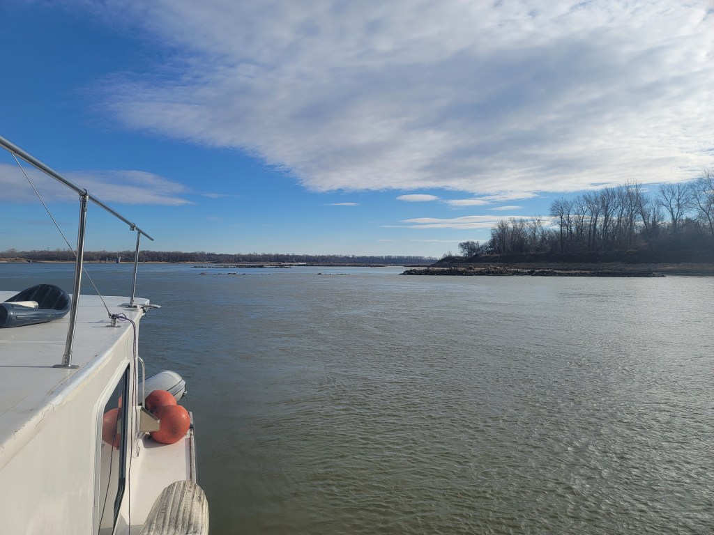 Everything on the rivers is in statute miles. Tonight I’m anchored here at LDB (left downbound bank) 94.3. It’s like an address. Mile 0 is the confluence with the Upper Mississippi. That’s 220 miles above the confluence with the Ohio River at Cairo IL. Then the Lower Missisippi starts counting down at mile 953. New Oreans is at mile 93. So I’m 1175 miles from New Orleans.