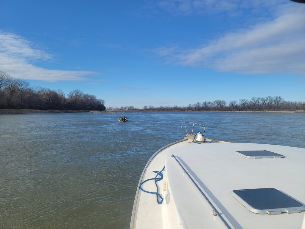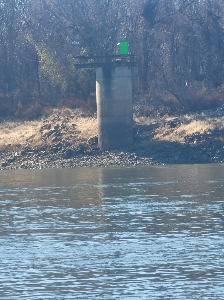 I’m anchored here at mile 1 on the Misouri River between two wing dams. Upriver I could travel 735 miles to Sioux City. Another time.