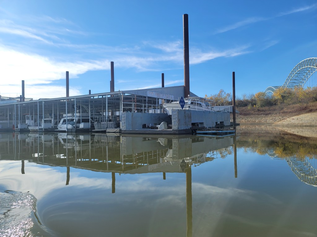 The pictures below were taken today in Mud Creek. The manager here owns Bombay Duck, a USN fiberglass tender built in the 1950s. Small version of Escapade. The cruise ship terminal is interesting, accommodating 50 ft of water level fluctuation. We’re about five feet above record low now, and about 45 feet below recent crests.