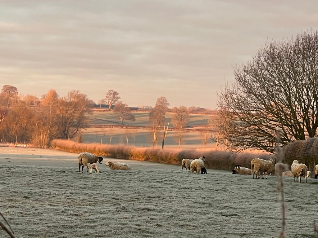 I have had frustrating sleep issues for the past several years, but one of the few benefits is that I have seen many a glorious sunrise. It is a promise of the new day. Sunday morning was no exception – the bird song and beautiful vistas surrounded me. I was delighted when I realized that I could see sheep and lambs through the barbed fence near our boat. Even though I stayed too long in the freezing cold, I managed to snap what I think are beautiful pictures of frost and the sheep.