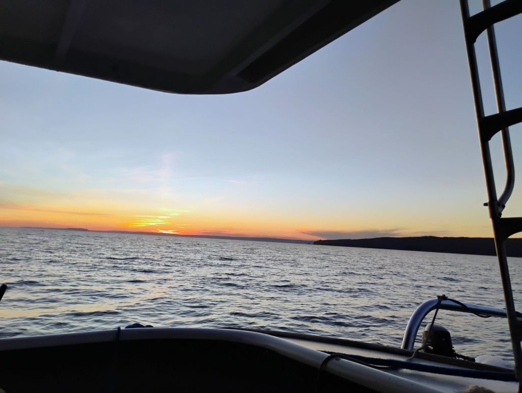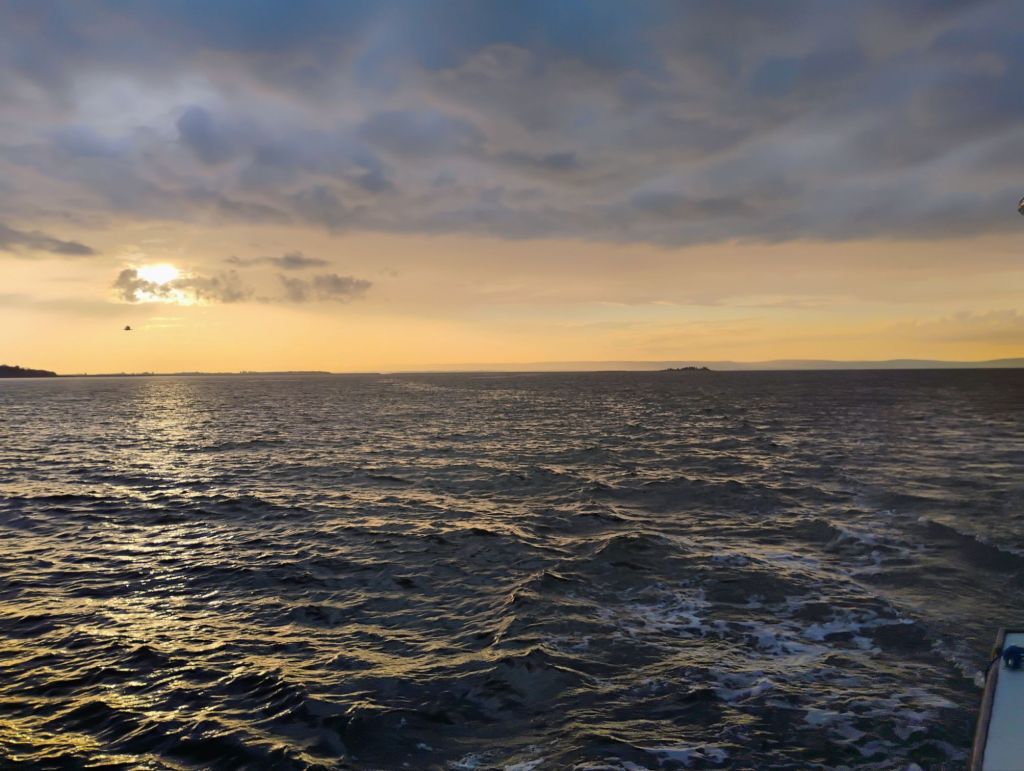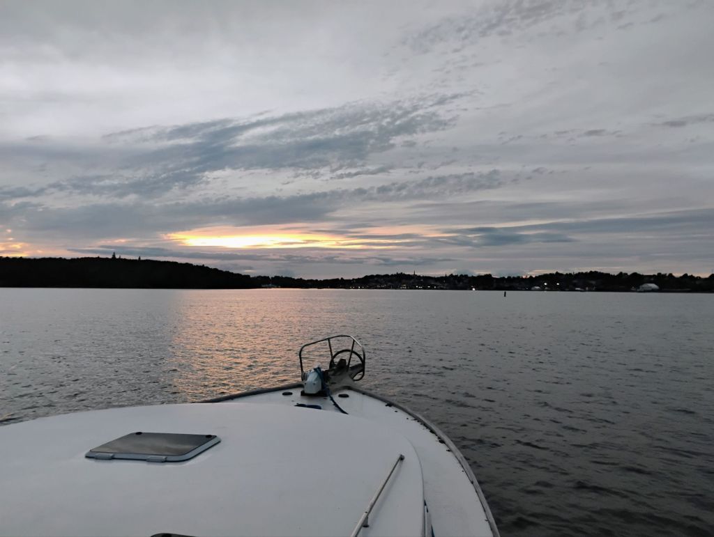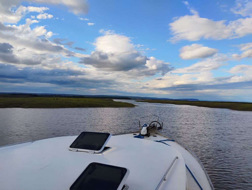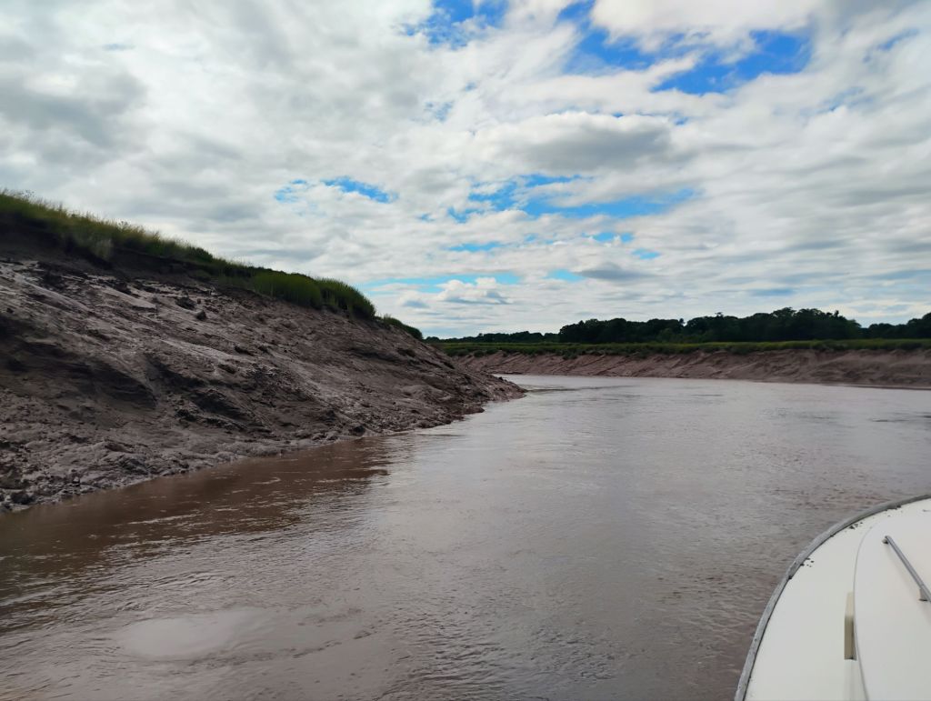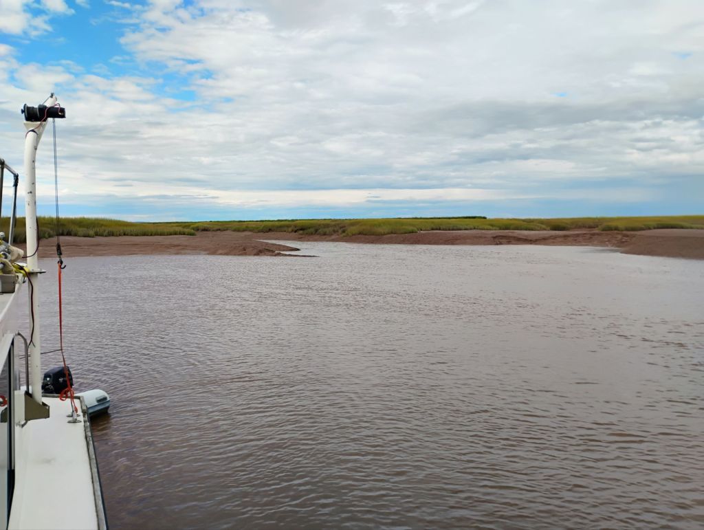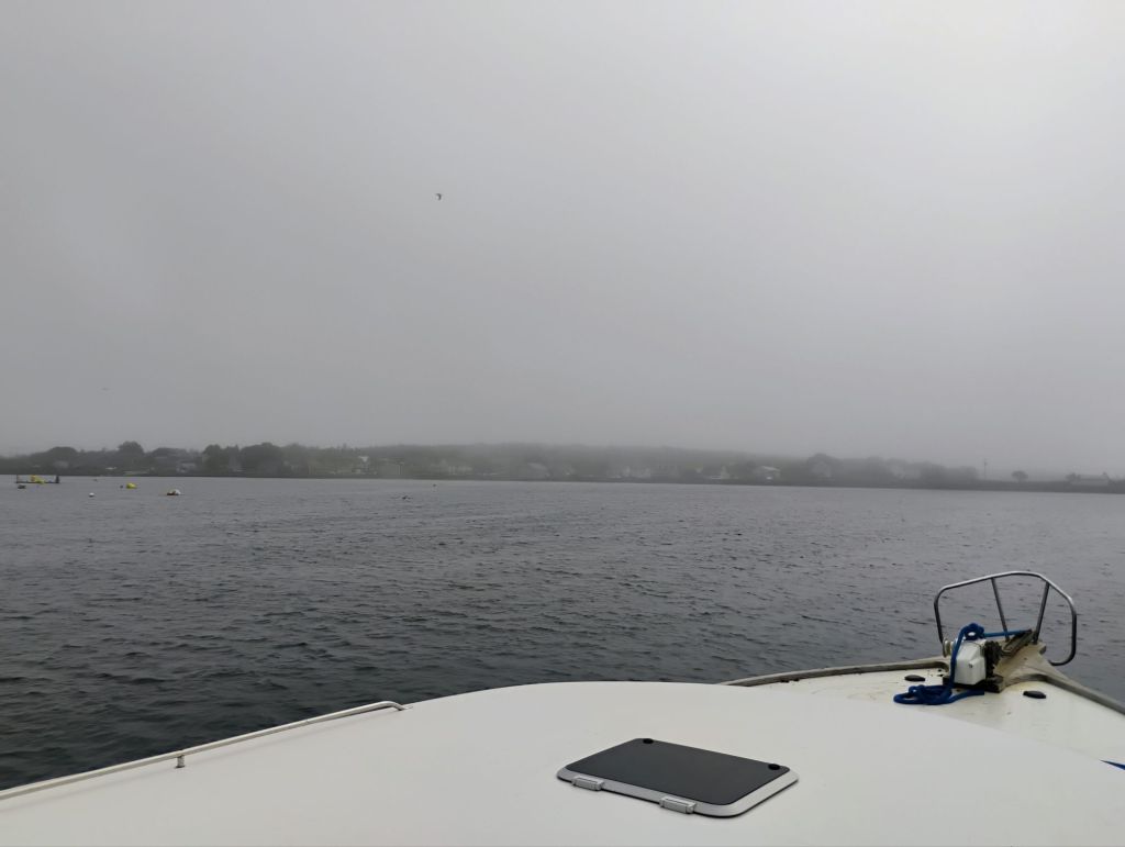 Things got a little weird after that. I’ve been replaying the events, and I think I drove down the front of a tidal bore. I was maintaining 4-5 mph boat speed for steerage, but speed over ground was increasing, and I could see the water dropping ahead of me. Just when I was getting concerned I grounded in the mud. Nothing dramatic, but a full stop, with the stream coming from astern.