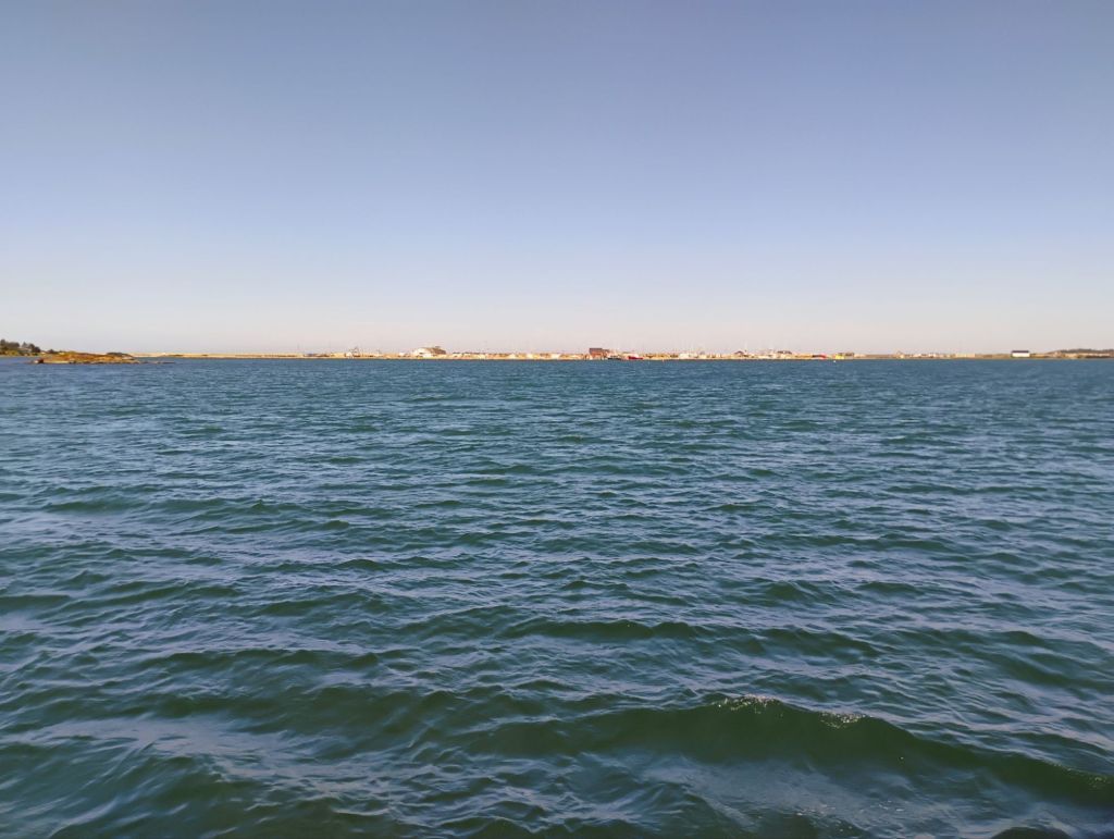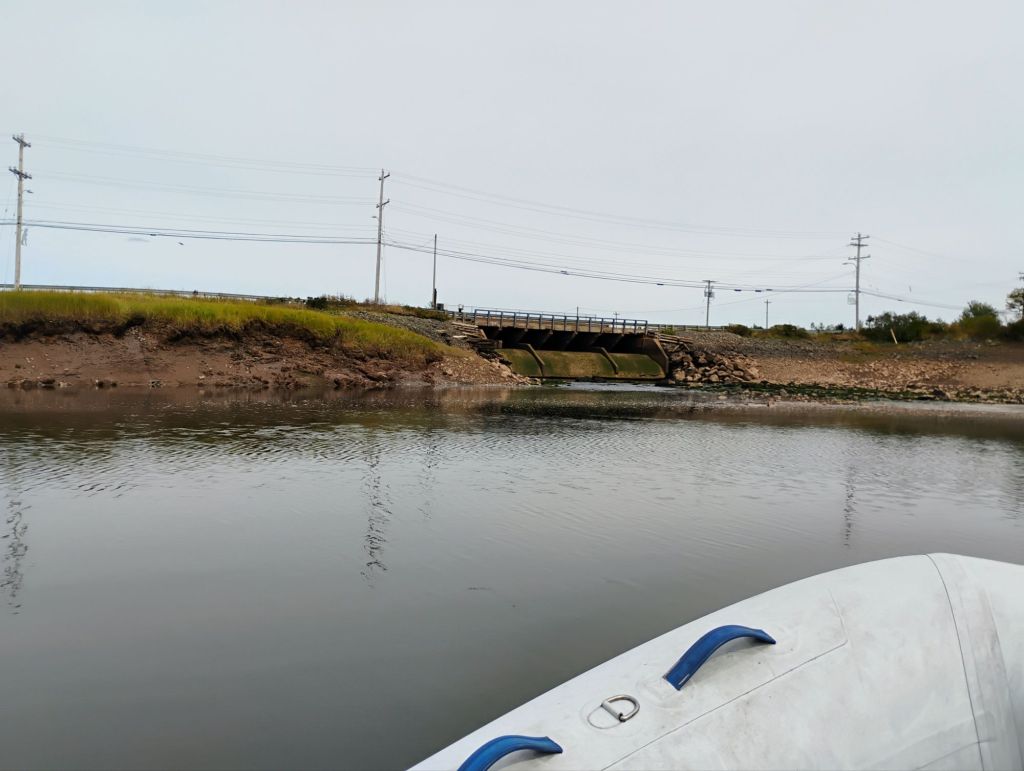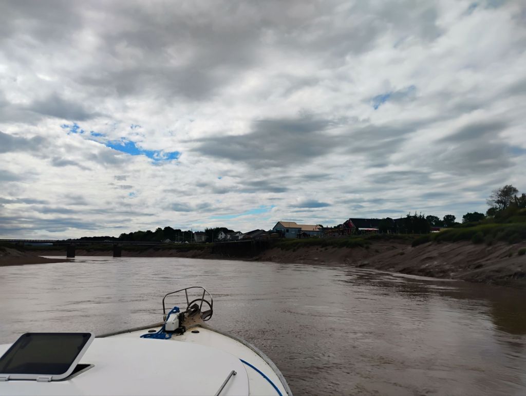 Wolfville was barely visible over the marsh when I came by. After that it was clearly a river. Smooth sailing up to Port Williams. I had a very strong tail current going under the bridge, and kept going on the twisty river.