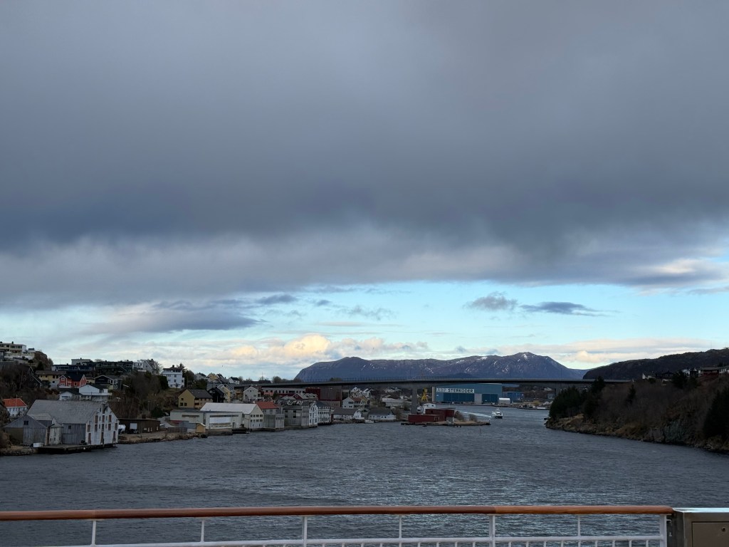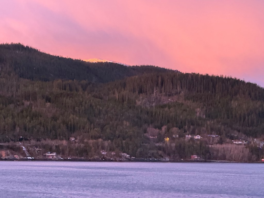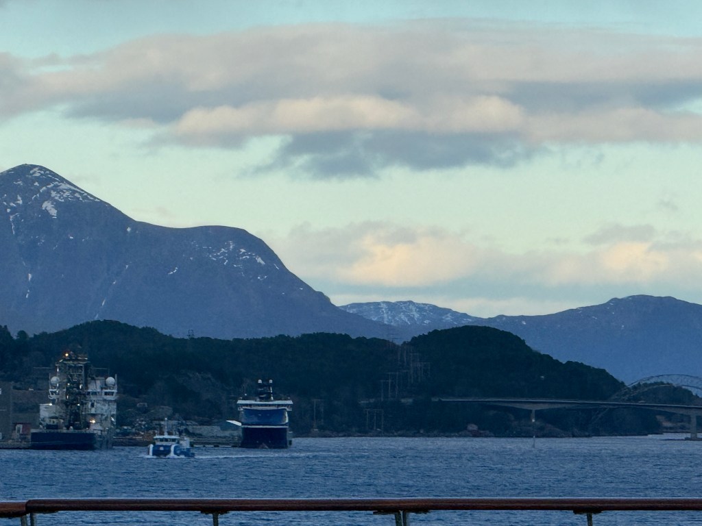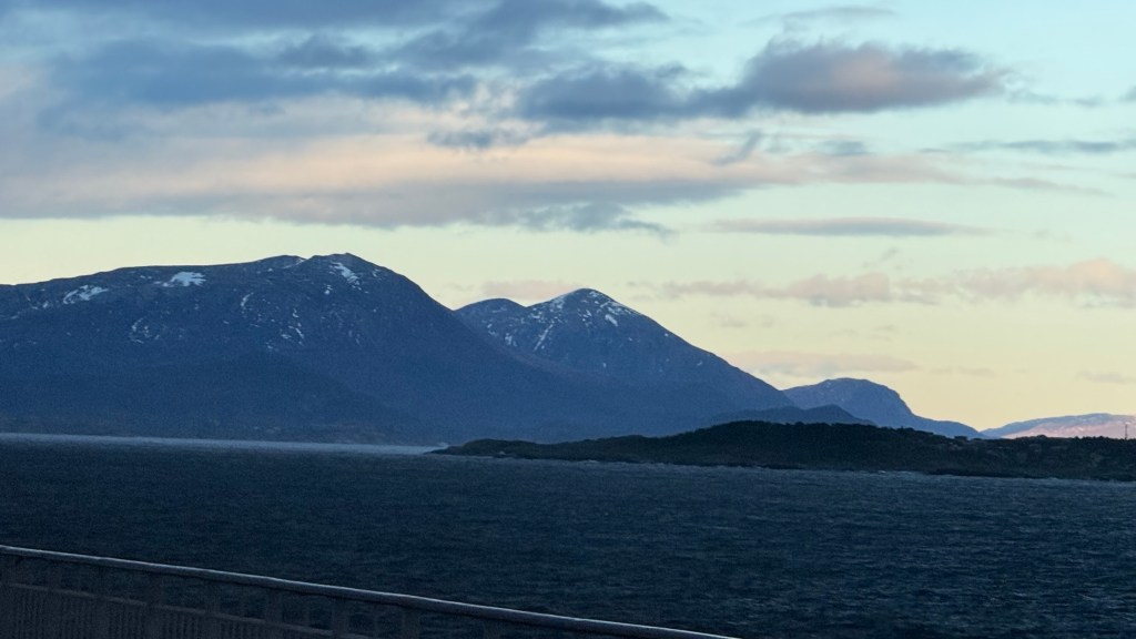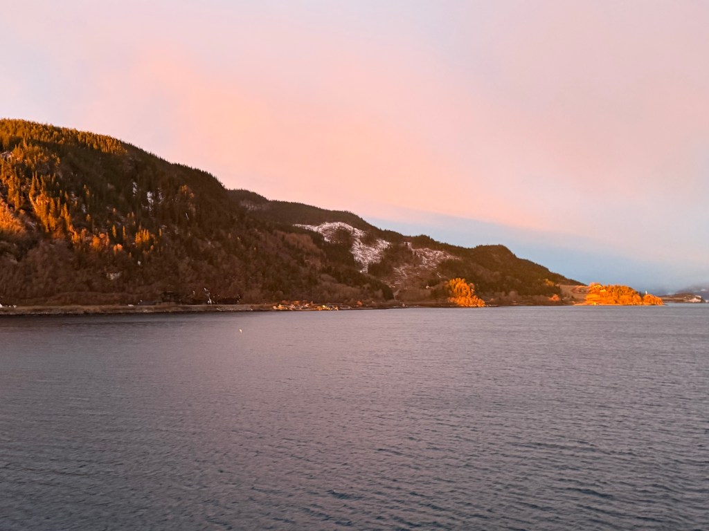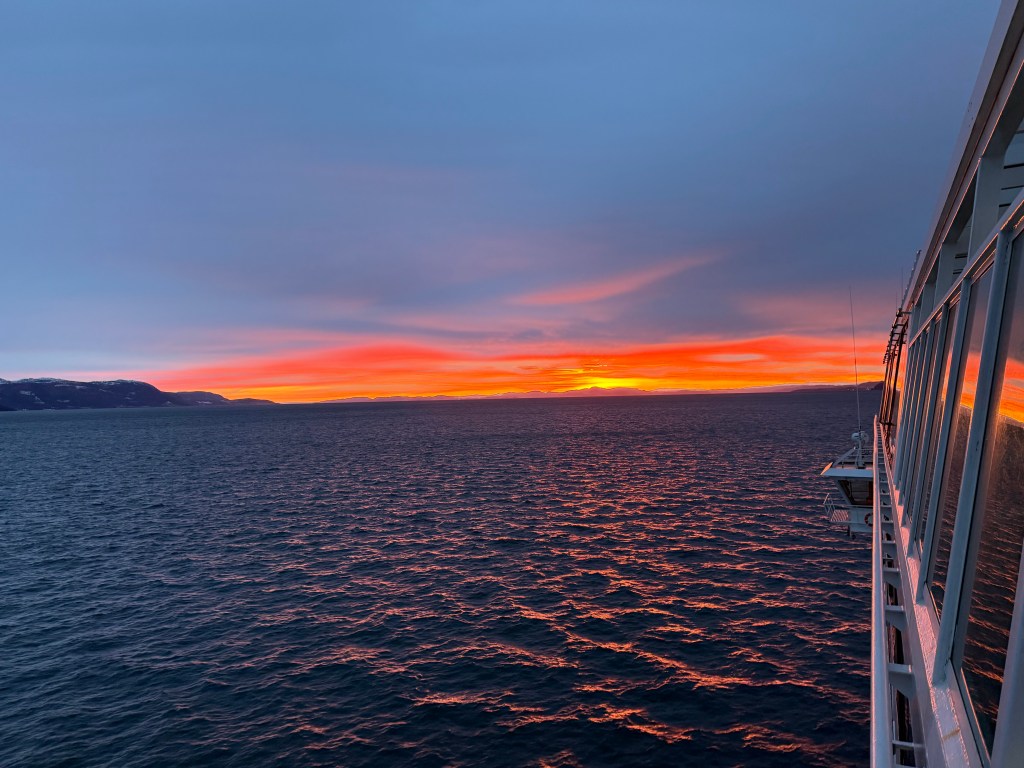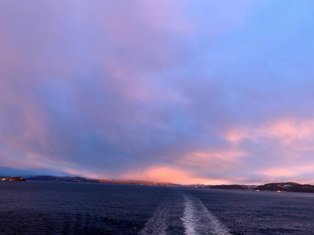 I often got up in the early morning to walk around the ship, looking for northern lights, and waiting for the sun to rise. These photos are from Storfosna (0411) to Averoy (1805).
