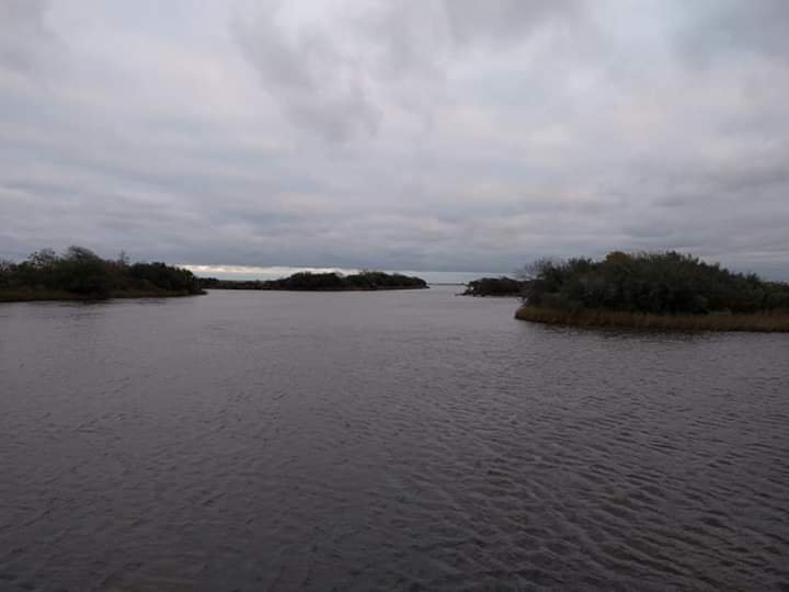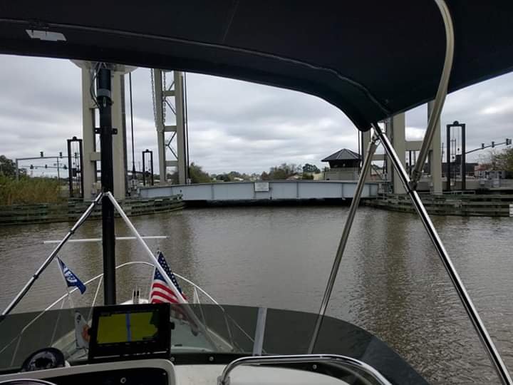 So… there we were, sitting on the top-deck, drinking our coffee and smoking while we lazily chugged along, chatting and scanning the landscape. Lots of boats! – this is more Jeff’s thing, but the number we saw, and the types, were impressive: lots for servicing the oil wells out in the Gulf, but also plenty of shrimp boats with their tell-tale nets hung out like wings from the boats’ sides. We also encountered a number of bridges which had to be opened for us and had been warned that this might eat up some time – and might even alter our route, as apparently some bridges won’t open at certain times of the day and season – but all proceeded according to plan, with no stoppages. The weather cleared as the day progressed, and while it remained a bit chilly, it got brighter.