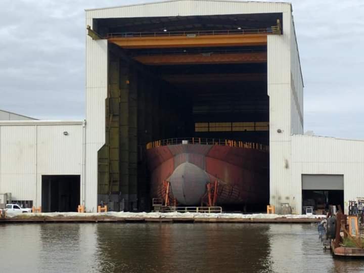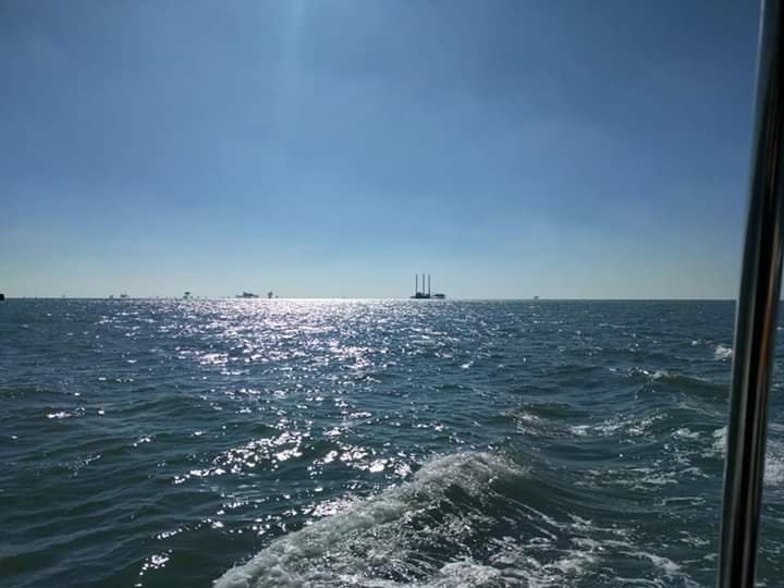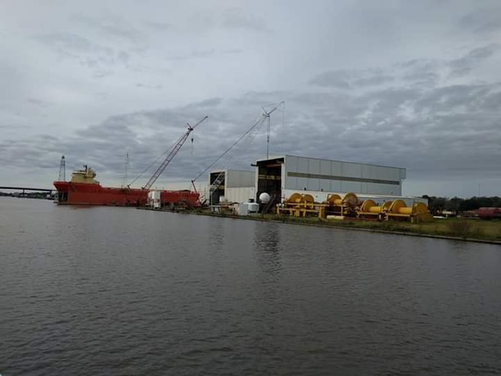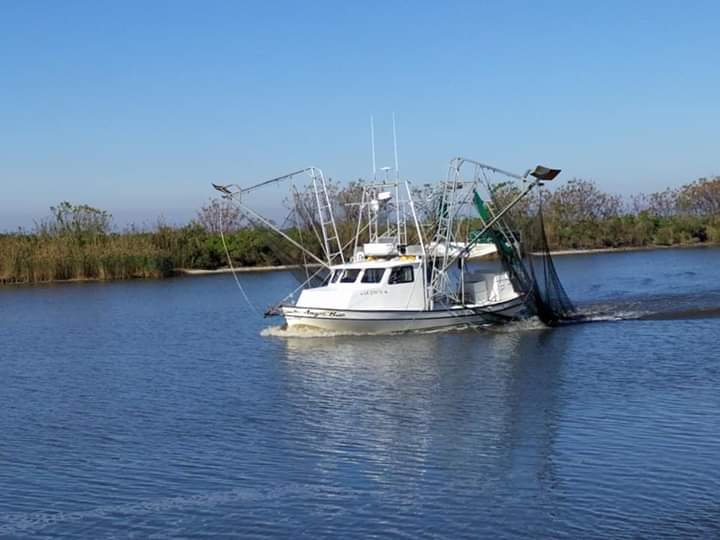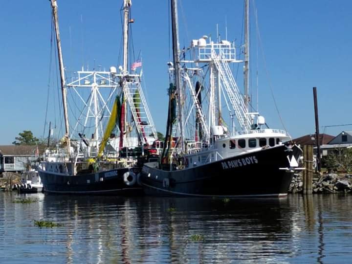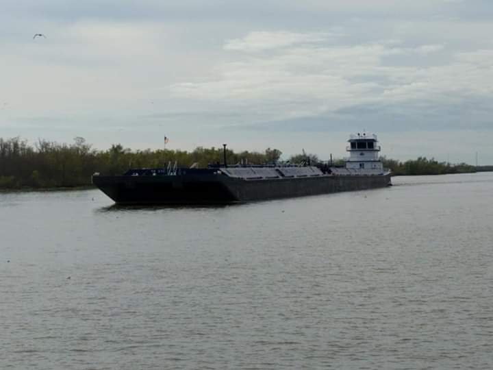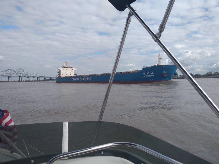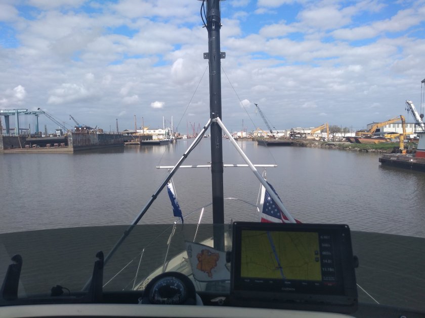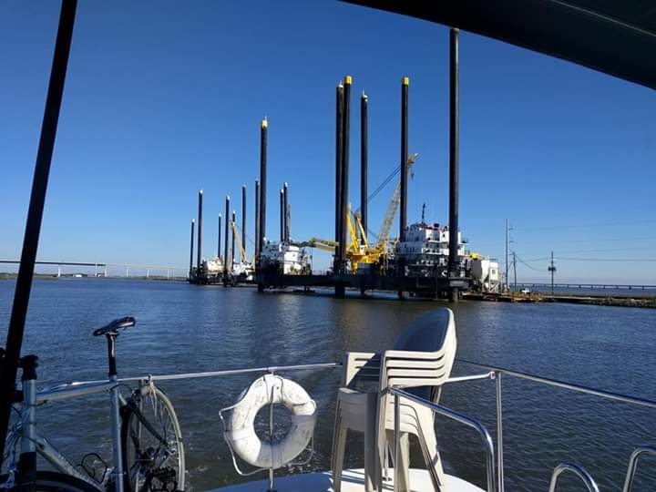 So… there we were, sitting on the top-deck, drinking our coffee and smoking while we lazily chugged along, chatting and scanning the landscape. Lots of boats! – this is more Jeff’s thing, but the number we saw, and the types, were impressive: lots for servicing the oil wells out in the Gulf, but also plenty of shrimp boats with their tell-tale nets hung out like wings from the boats’ sides. We also encountered a number of bridges which had to be opened for us and had been warned that this might eat up some time – and might even alter our route, as apparently some bridges won’t open at certain times of the day and season – but all proceeded according to plan, with no stoppages. The weather cleared as the day progressed, and while it remained a bit chilly, it got brighter.